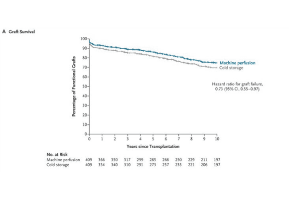 Follow up data collected a decade after participants’ transplant surgery confirm and strengthen earlier findings, showing that kidney preservation with LifePort Kidney Transporter significantly reduces delayed graft function and improves long-term graft survival, particularly in expanded-criteria donor (ECD) kidneys. Specifically, the data demonstrates that ECD kidneys perfused on LKT have improved graft survival at 10 years at 69.6% versus 60.1% graft survival with standard cold storage (SCS). Overall, there was a 27% lower risk of graft failure for all kidneys in the machine perfusion group versus SCS.